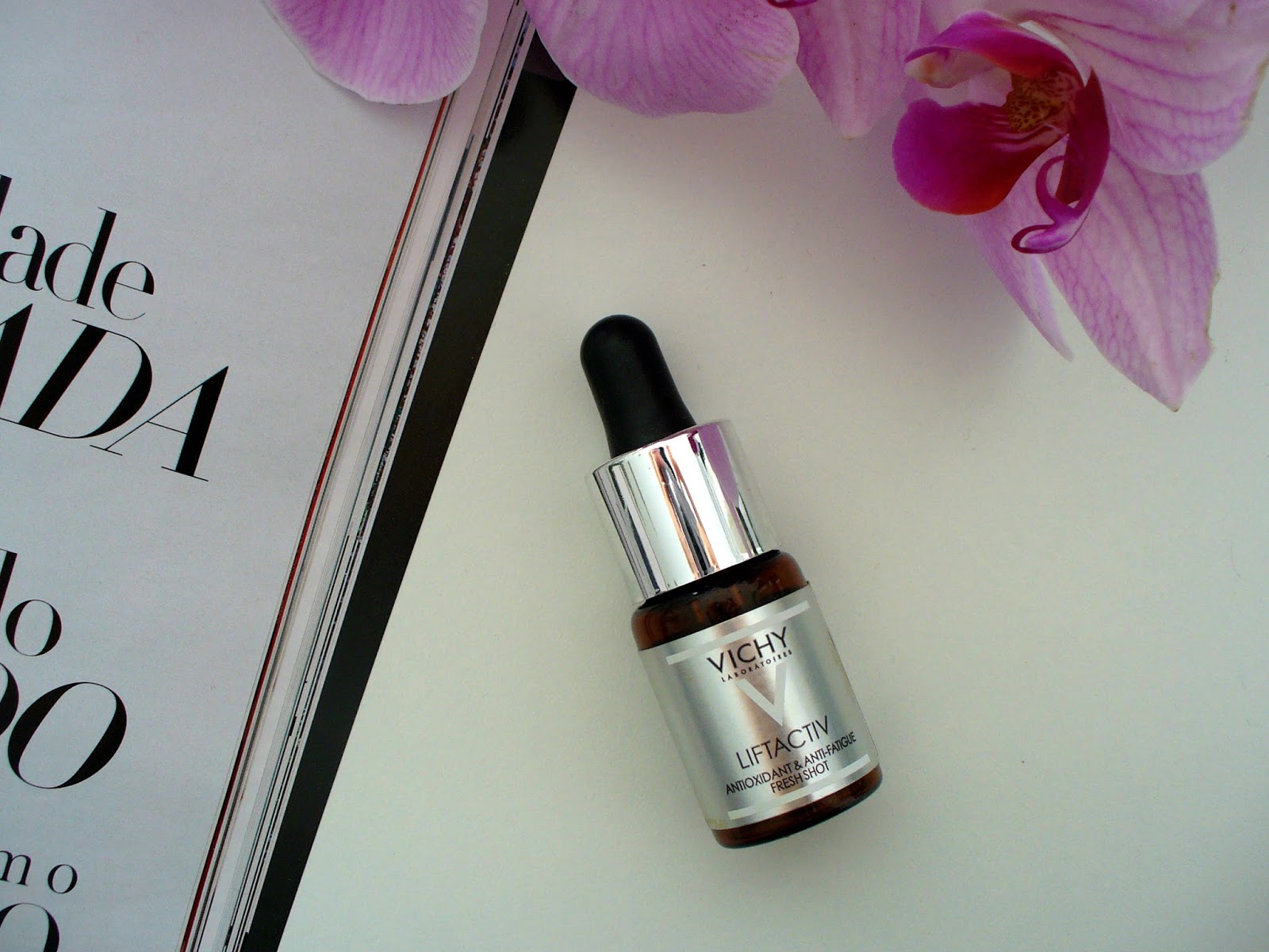 Foi por esse motivo que fiquei especialmente atraída pelo mais recente lançamento da Vichy, o Liftactiv Fresh Shot. A constante publicidade em revistas e farmácias era e é imensa e a promessa de ser o boost ideal para peles de mulheres muito activas e sem tempo para nada que acumulam stress e fadiga fez-me querer experimentar na esperança que surtisse algum efeito na minha tez tão sem vida.